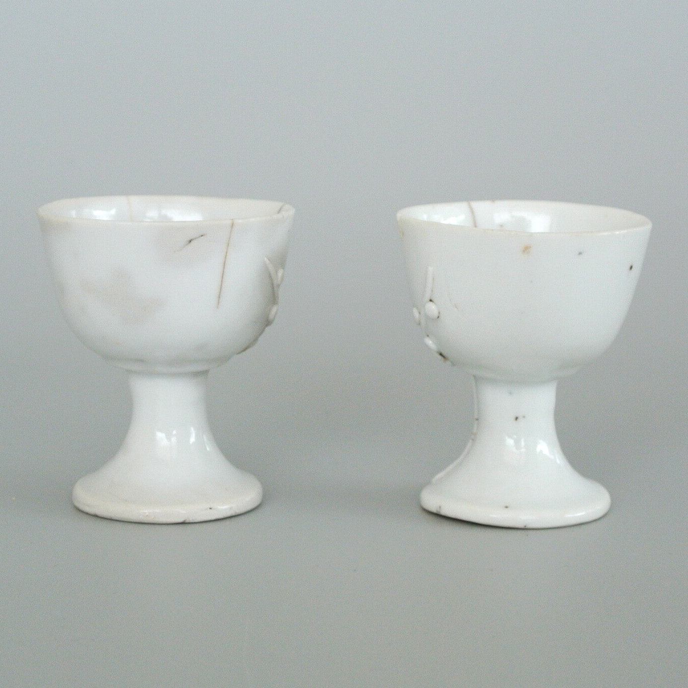 A pair of ''Blanc de Chine'' stem cups, decorated with lotus flowers which are modeled on the outside. Kangxi period (1662-1722) made in Dehua, Fujian (China) known for its production in mainly white glazed porcelain, this because of the pure quality of the less iron-containing clay here. Used for personal offering/devotion rituals.