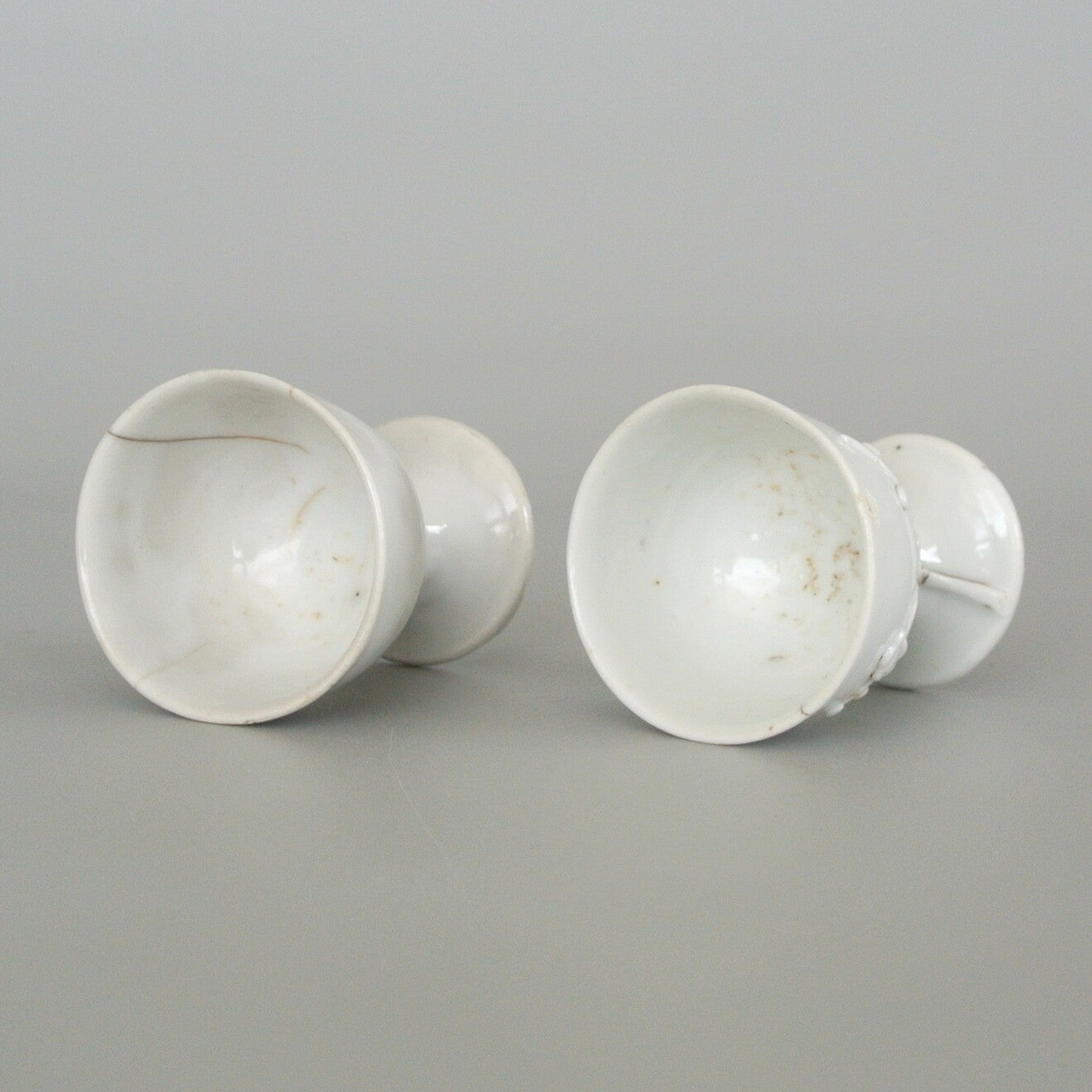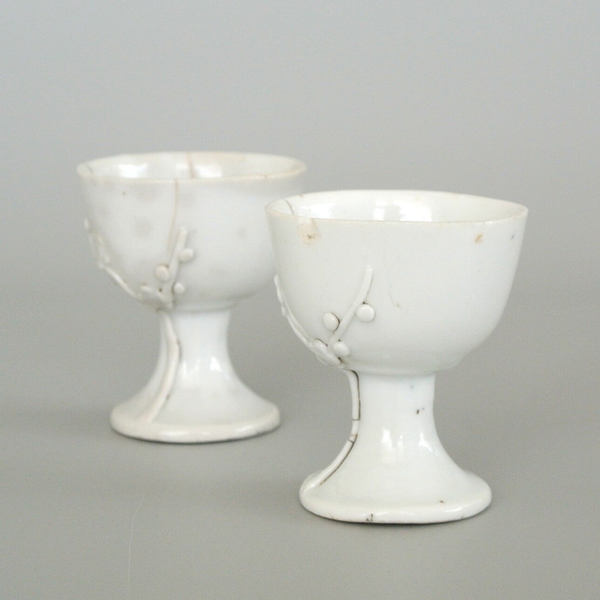 Een paar ''Blanc de Chine'' stemcups, gedecoreerd met lotusbloemen welke op de buitenkant zijn gemoddeleerd.