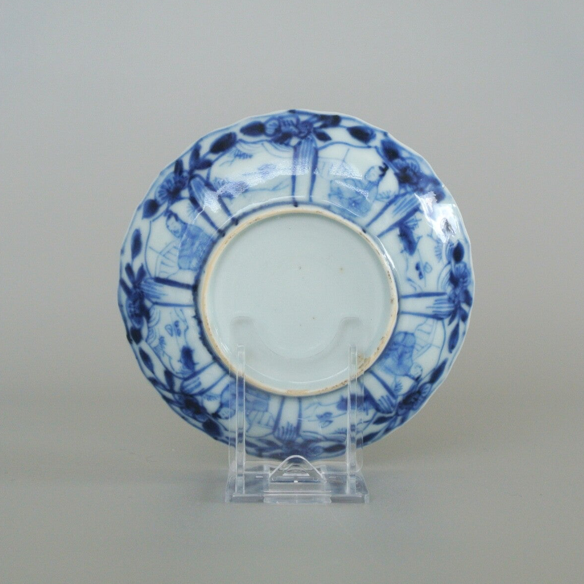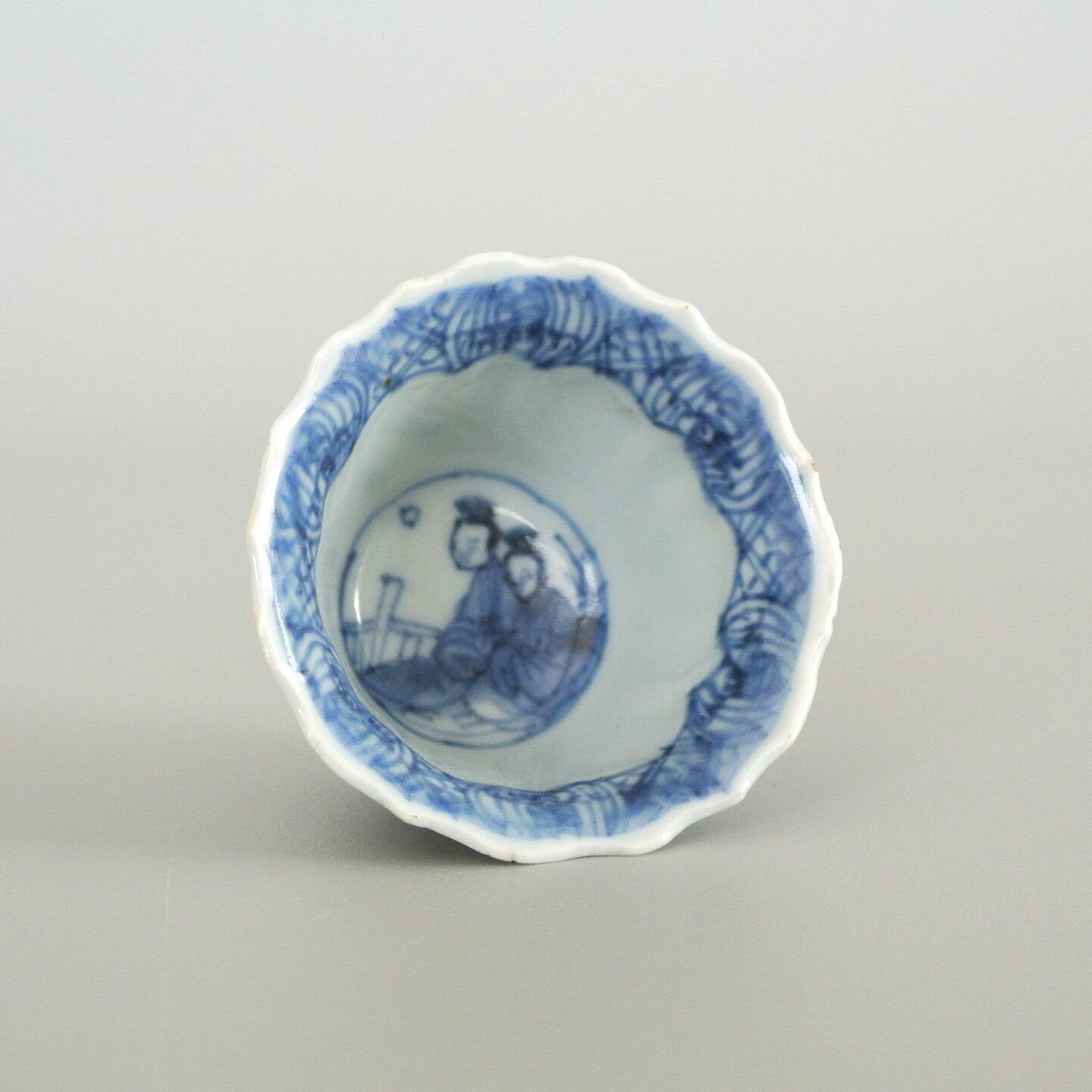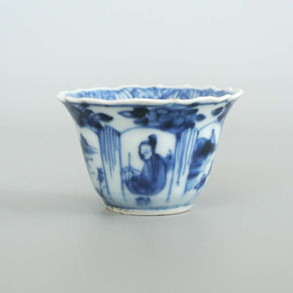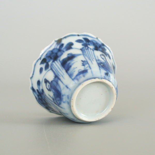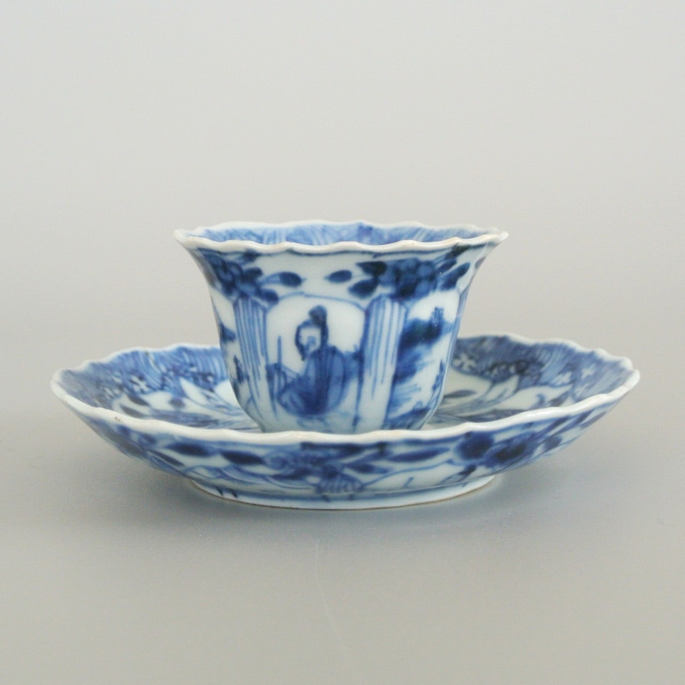 A very fine and delicate blue and white potted cup and saucer with repeating "long eliza' motif. In the centre of both the saucer and the cup a seated duo can be seen in a garden, surrounded by a division of planes with floral motifs.