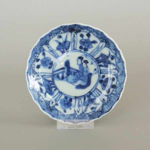 Hierbij een zeer fijn en delicaat blauwwit beschilderde kop en schotel met herhalend lange lijs of 'Long Eliza'-motief. In het centrum van zowel de schotel als het kopje is een zittend duo te zien in een tuin, omringt door een vlakverdeling met florale motieven.