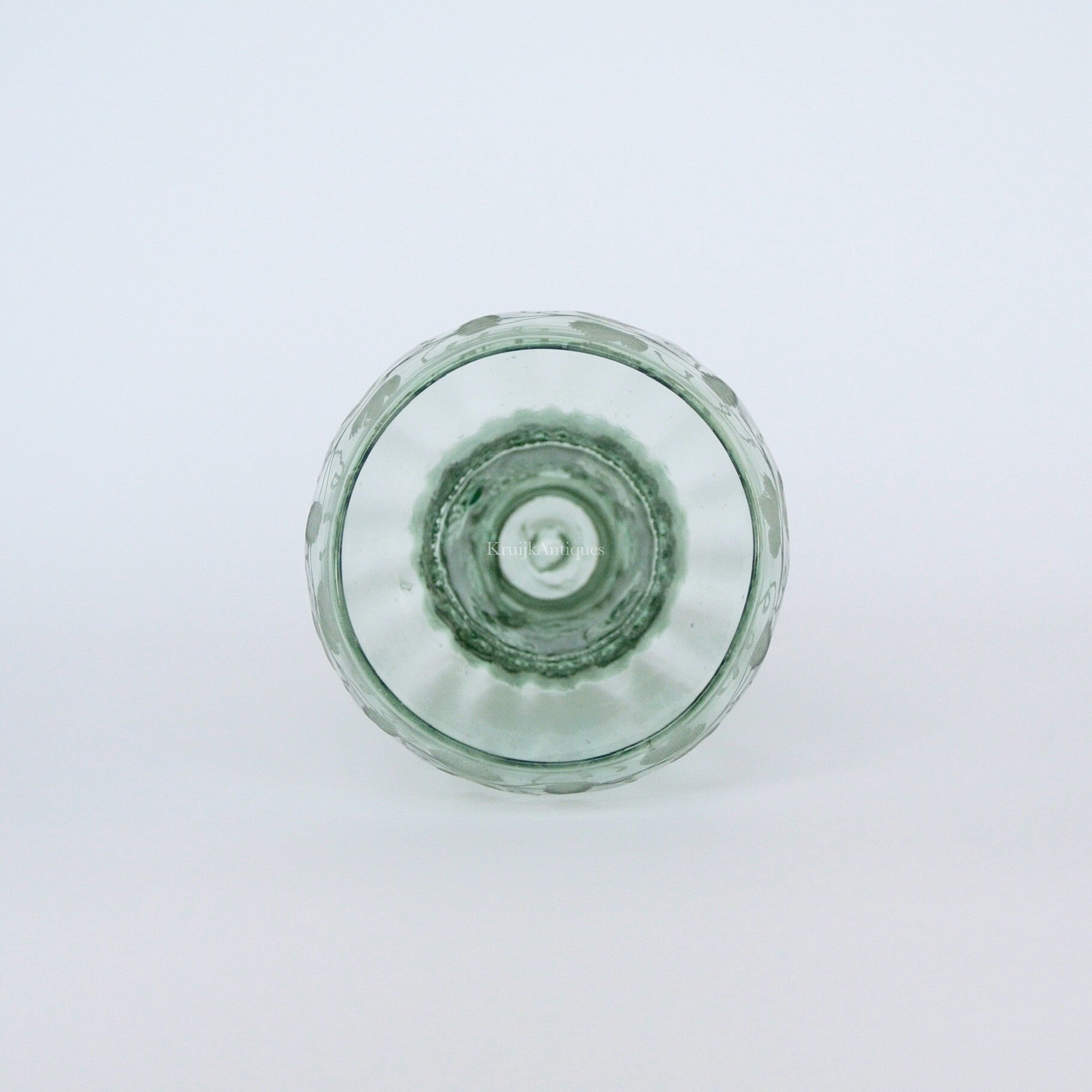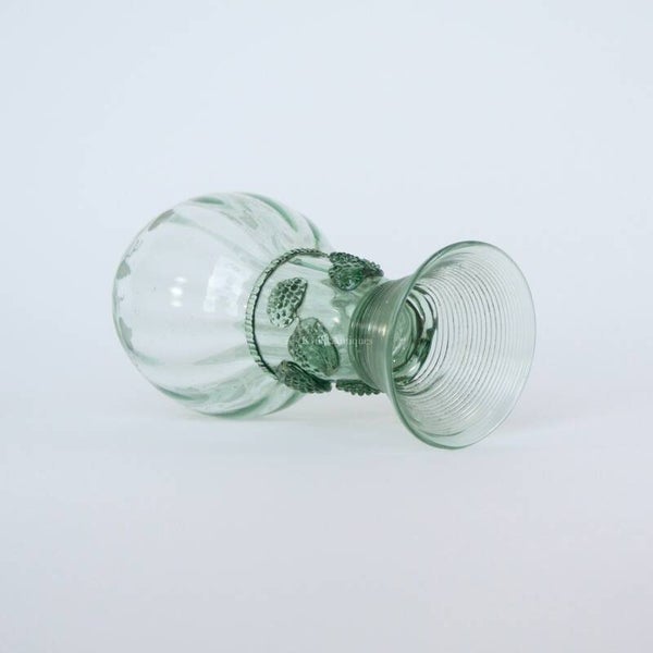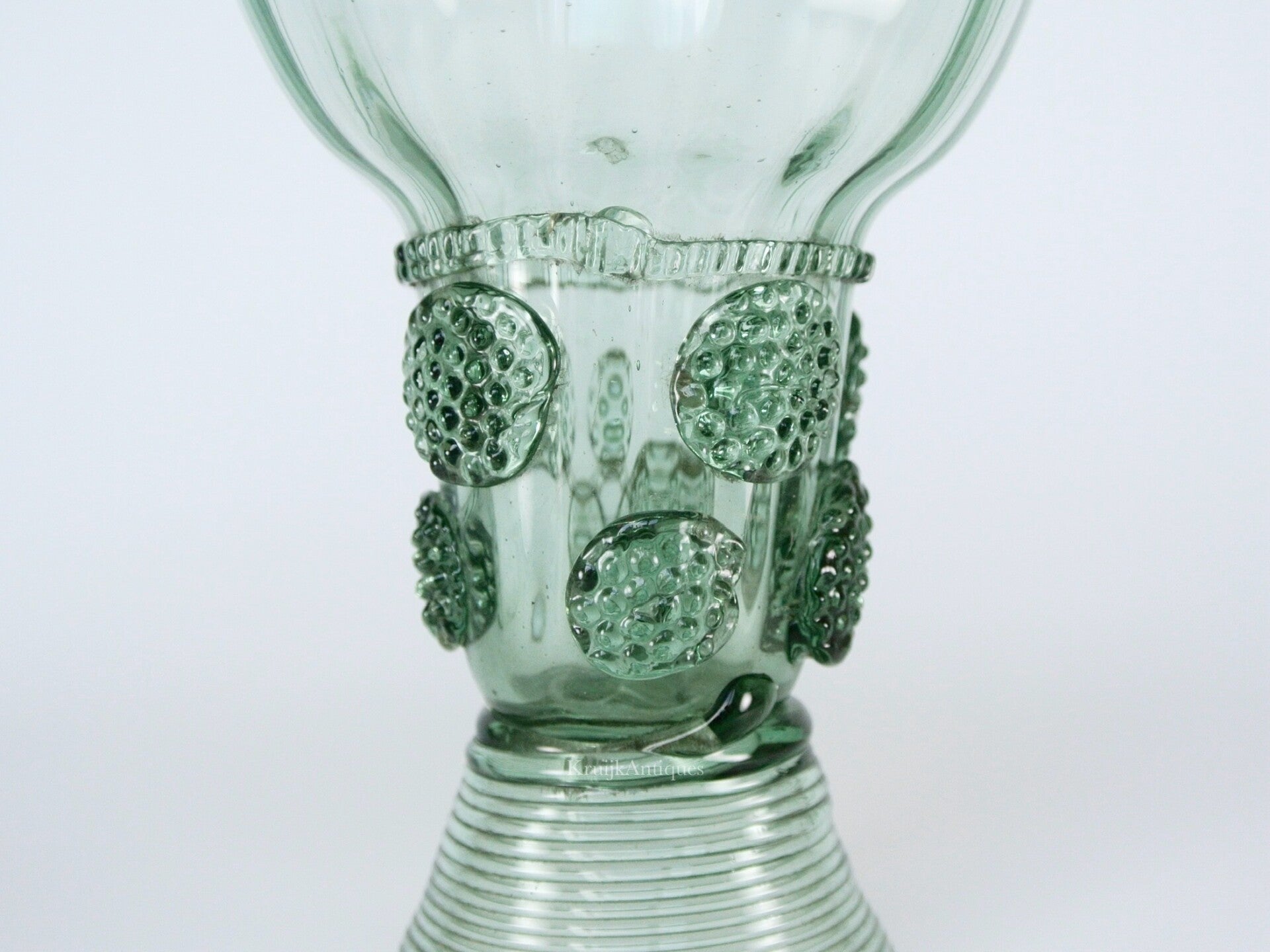 Hierbij een zeer mooi en fijn geblazen roemer glas met dat opgebouwd is vanaf een konische voet met taps toe lopende ringen, met daar bovenop een brede stam met bramen knoppen voor de grip, de bol-vormige kelk heeft verticaal lopende ribbelds met aan de mond een radgravure van wijnranken. Funfact: wat men hier precies uit dronk valt niet moeilijk te gissen.