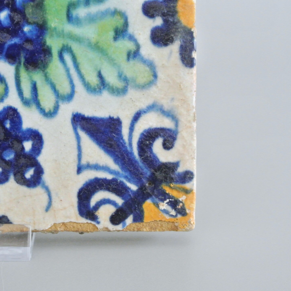 This is an early 17th-century polychrome ornamental tile with a fleur de lis in the corners, diagonally opposite each other, and a full bunch of grapes in the center that almost jumps out. The bunch of grapes has a rich decorative appearance and symbolic meaning, both in religious and secular contexts. It often symbolizes abundance, fertility, and joy. Furthermore, the bunch of grapes is also used as a symbol of community and solidarity, as it often grows with multiple grapes on a single vine.